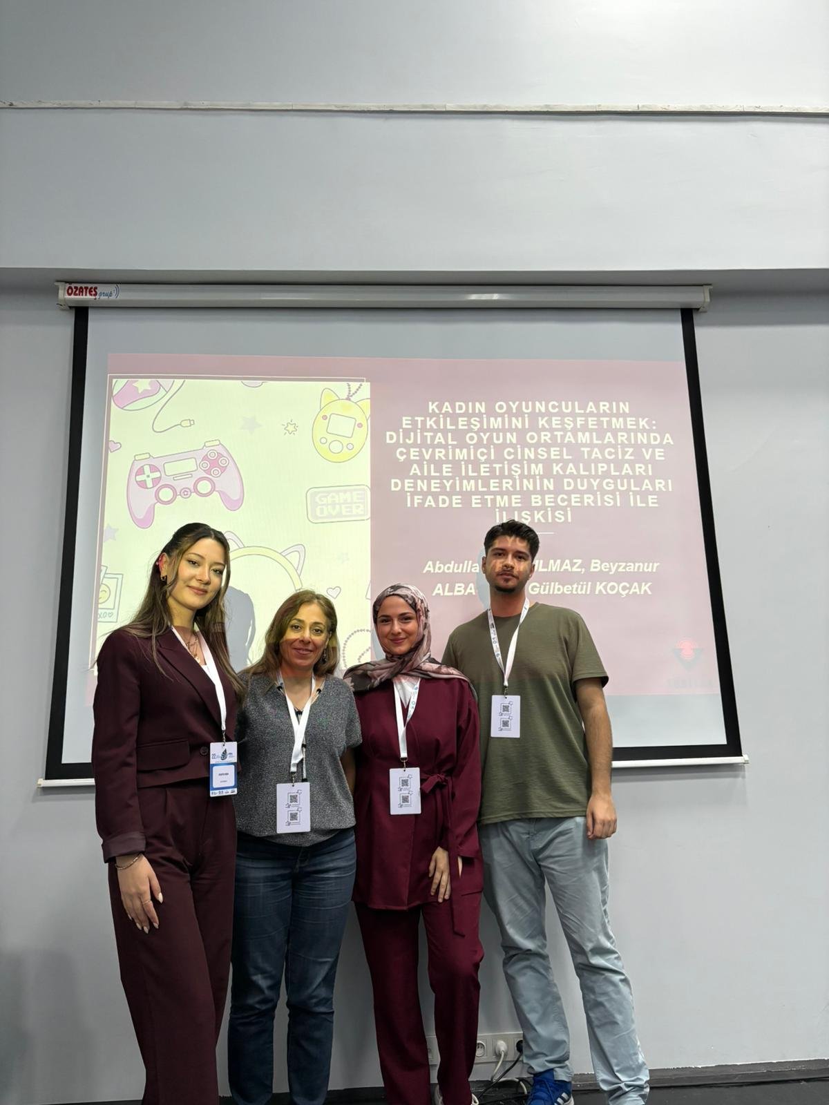 TÜBİTAK 2209-A Öğrenci Projesi kapsamında, Dr. Öğretim üyemiz Sema Yurduşen danışmanlığında yürütülen ve mezun öğrencimiz Beyzanur Albayrak, Gülbetül Koçak ve Abdullah Yorulmaz tarafından gerçekleştirilmiş olan "Kadın Oyuncuların Etkileşimini Keşfetmek: Dijital Oyun Ortamlarında Çevrim İçi Cinsel Taciz, Aile İletişim Kalıpları Deneyimlerinin Duygusal İfade Becerisi ile İlişkisi" sözlü bildiri ve