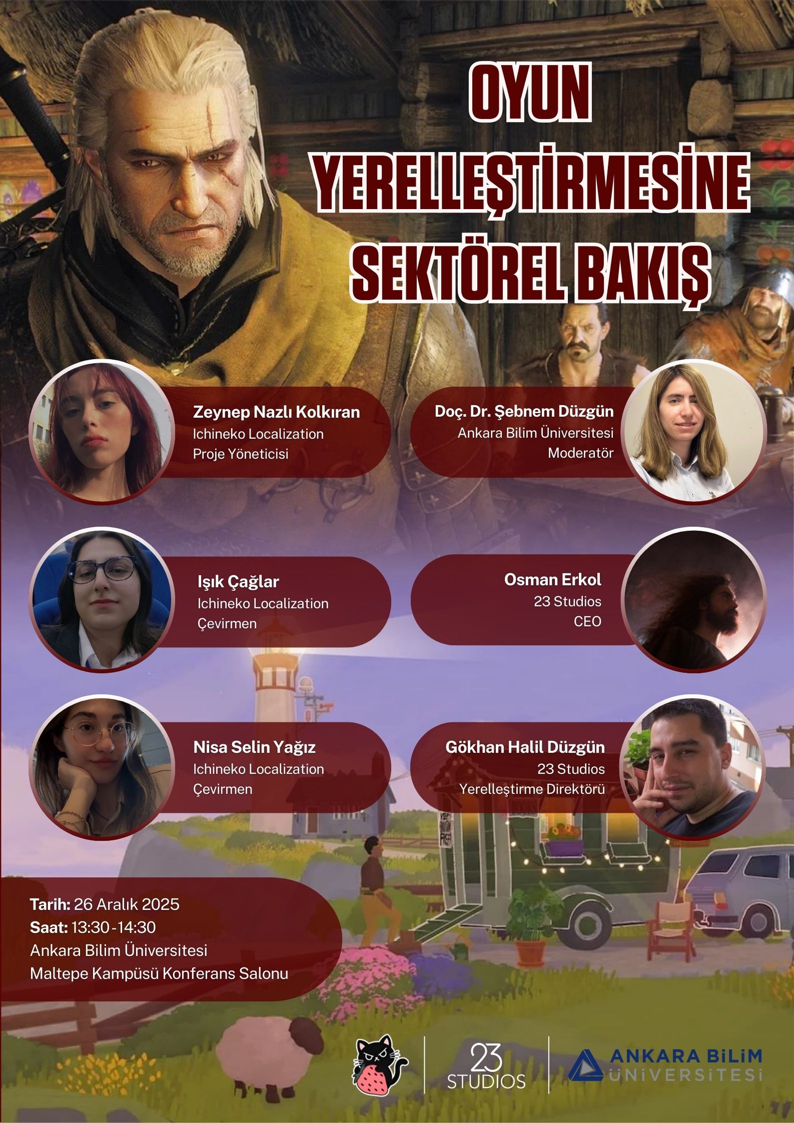 Within our "English Translation and Interpretation Seminar Series", "An Industrial Perspective on Game Localization" event will be held at 26th of December 2025, at 13:30 pm, with the participation of Osman Erkol (CEO, 23 Studios), Gökhan Halil Düzgün (Localization Director, 23 Studios), our students and the founding members of İchineko Localization Zeynep Nazlı Kolkıran, Işık Çağlar, Nisa Selin Yağız. We expect your kind attendance.