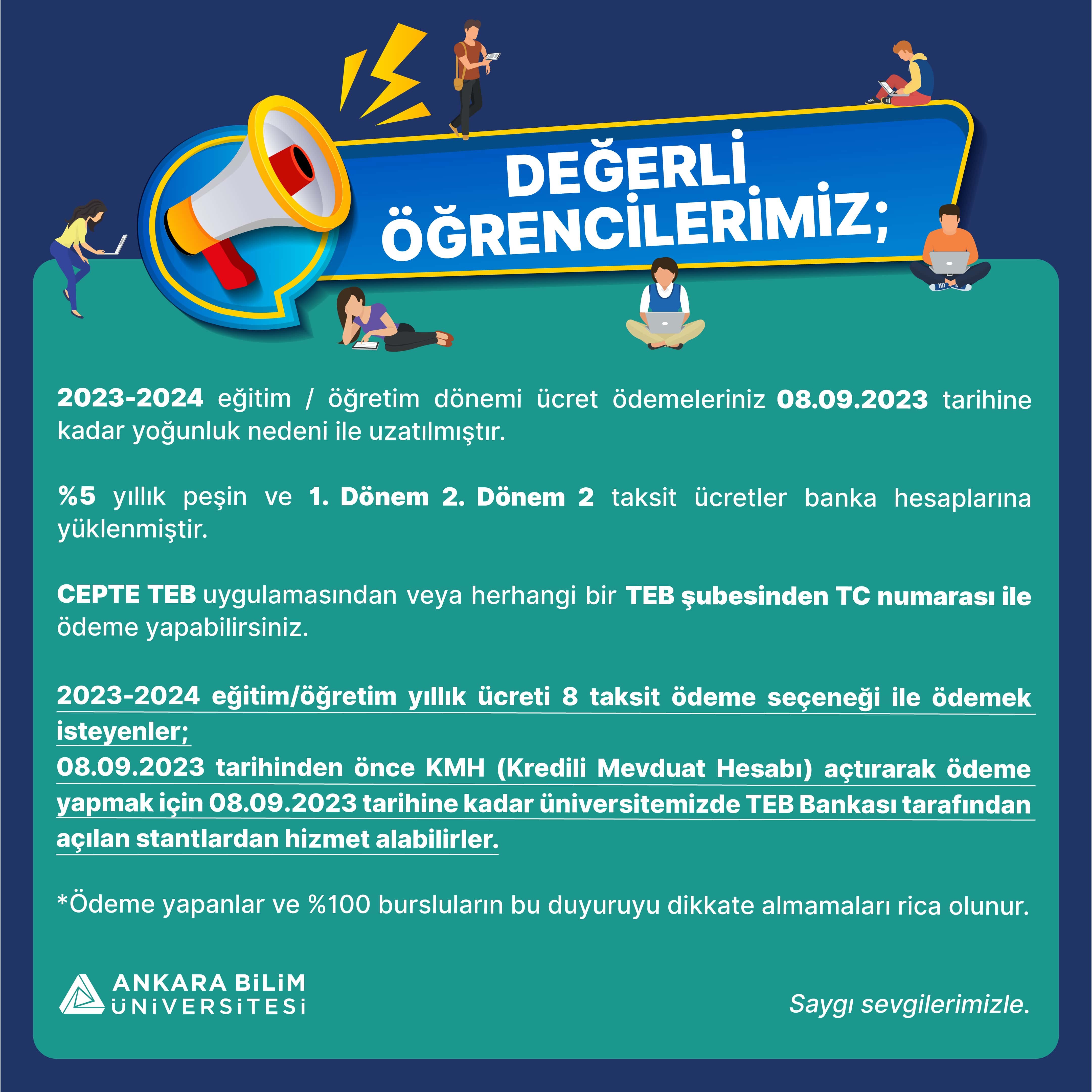 08.09.2023 tarihinden önce MH (Kredili Mevduat Hesabi) açtırarak ödeme yapmak icin 08.09.2023 tarihine kadar üniversitemizde TEB Bankası tarafından açılan stantlardan hizmet alabilirler.
