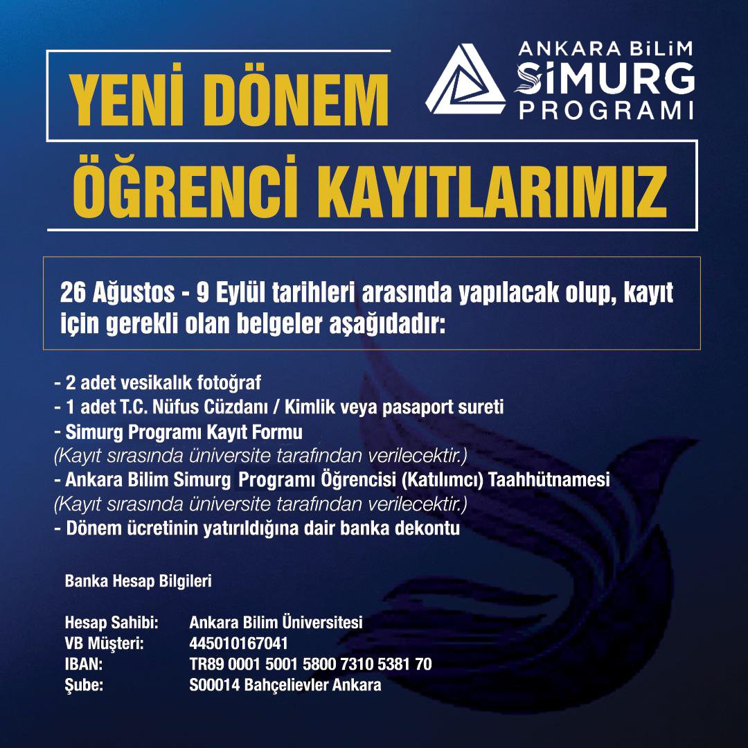 Ankara Bilim Üniversitesi Simurg Programı güz dönemi yeni öğrenci kayıtlarımız ve devam eden öğrencilerimiz için kayıt yenileme işlemleri başlamış olup, 26 Ağustos-9 Eylül 2024 tarihleri süresince devam edecektir.