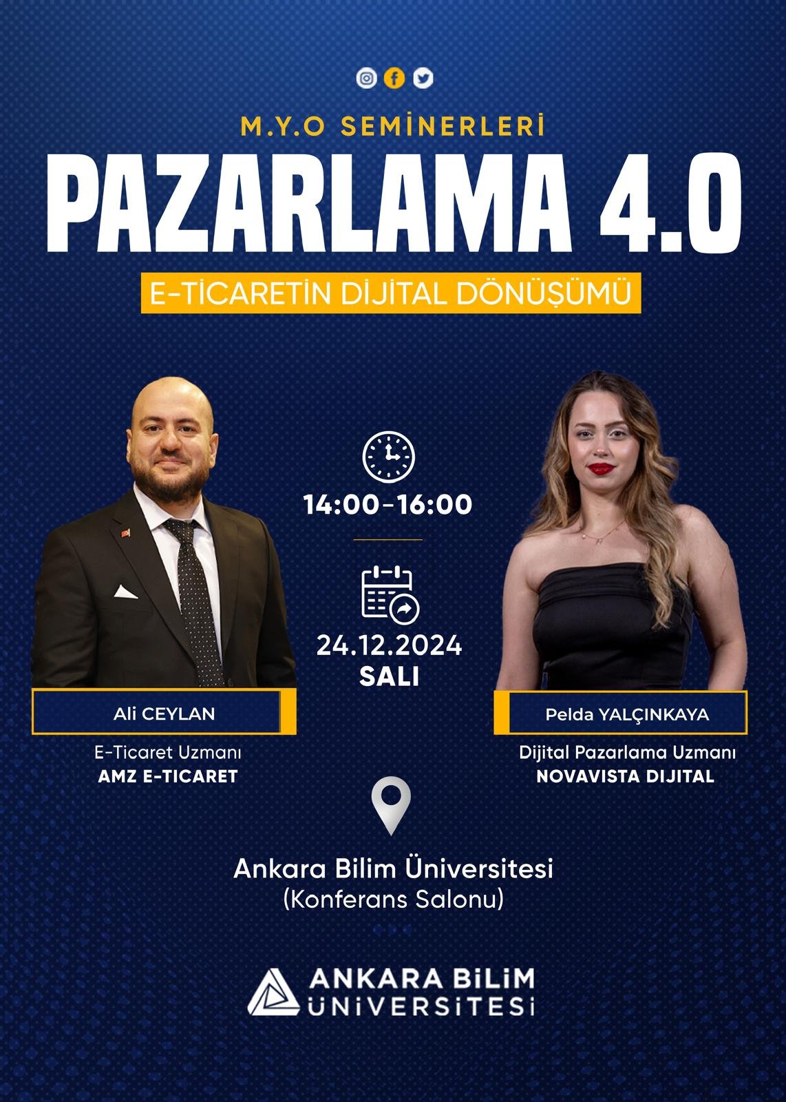 Ankara Bilim Üniversitesi Meslek Yüksekokulu (MYO) E-Ticaret ve Pazarlama Programı tarafından düzenlenen, "Pazarlama 4.0: E-Ticaretin Dijital Dönüşümü" başlıklı seminerde sektörün öncü isimlerinden (AMZ E-Ticaret) E-Ticaret Uzmanı Ali CEYLAN ve (Novavista Dijital) Dijital Pazarlama Uzmanı Pelda YALÇINKAYA konuğumuz olacaktır.  Katılımcılar, e-ticaretin dijital dönüşümünü, yeni pazarlama stratejilerini ve dijital dünyadaki yenilikçi uygulamaları keşfetme fırsatı bulacaklardır.
