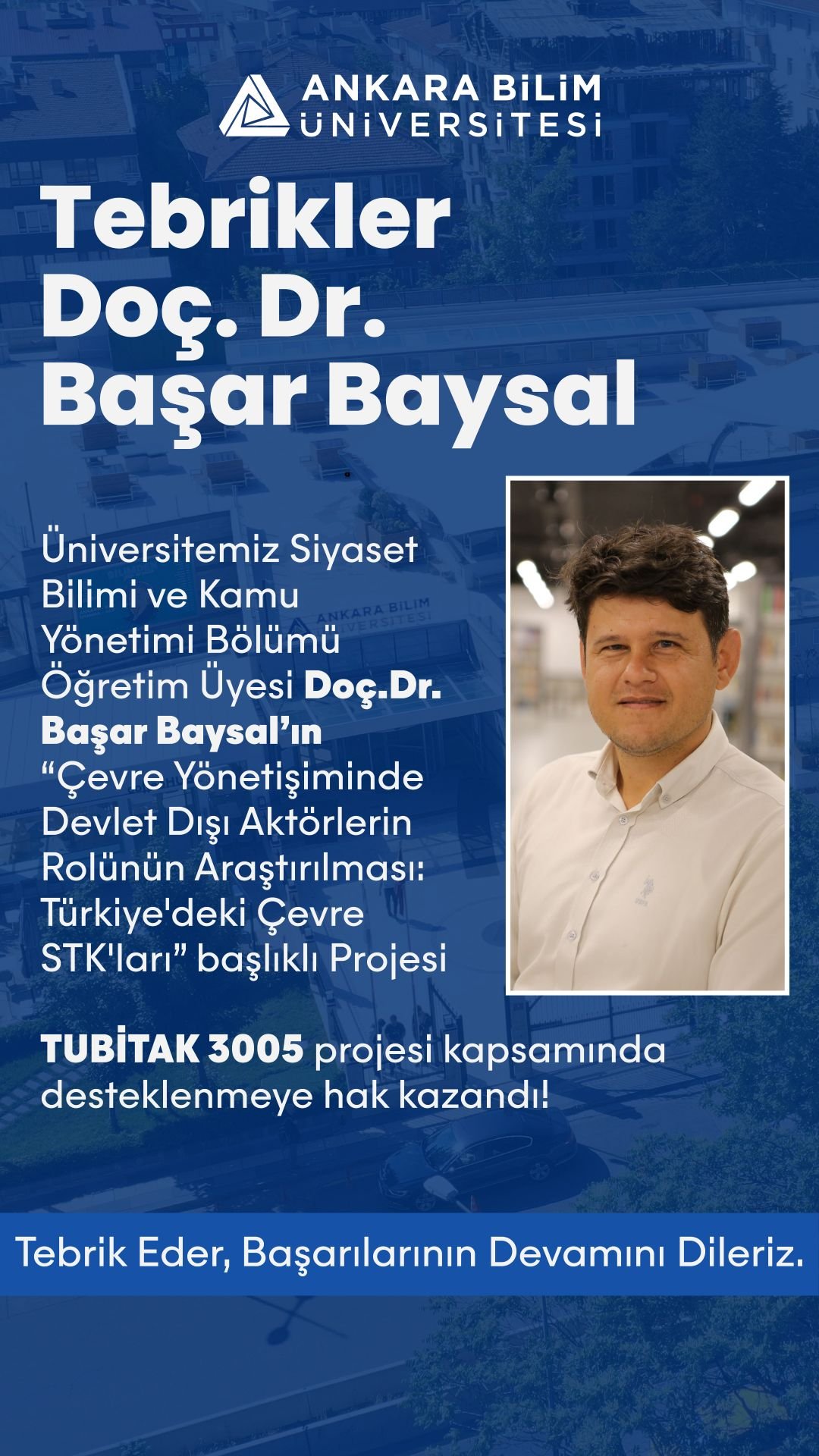 Üniversitemiz Siyaset Bilimi ve Kamu Yönetimi Bölümü Öğretim Üyesi Doç.Dr. Başar Baysal’ın “Çevre Yönetişiminde Devlet Dışı Aktörlerin Rolünün Araştırılması: Türkiye'deki Çevre STK'ları” başlıklı Projesi TUBİTAK 3005 projesi kapsamında desteklenmeye hak kazandı!