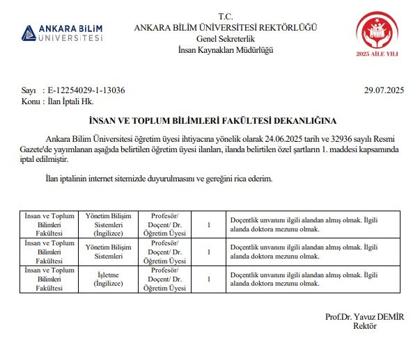 Ankara Bilim Üniversitesi öğretim üyesi ihtiyacına yönelik olarak 24.06.2025 tarih ve 32936 sayılı Resmi Gazete'de yayımlanan aşağıda belirtilen öğretim üyesi ilanları, ilanda belirtilen özel şartların 1. maddesi kapsamında iptal edilmiştir.