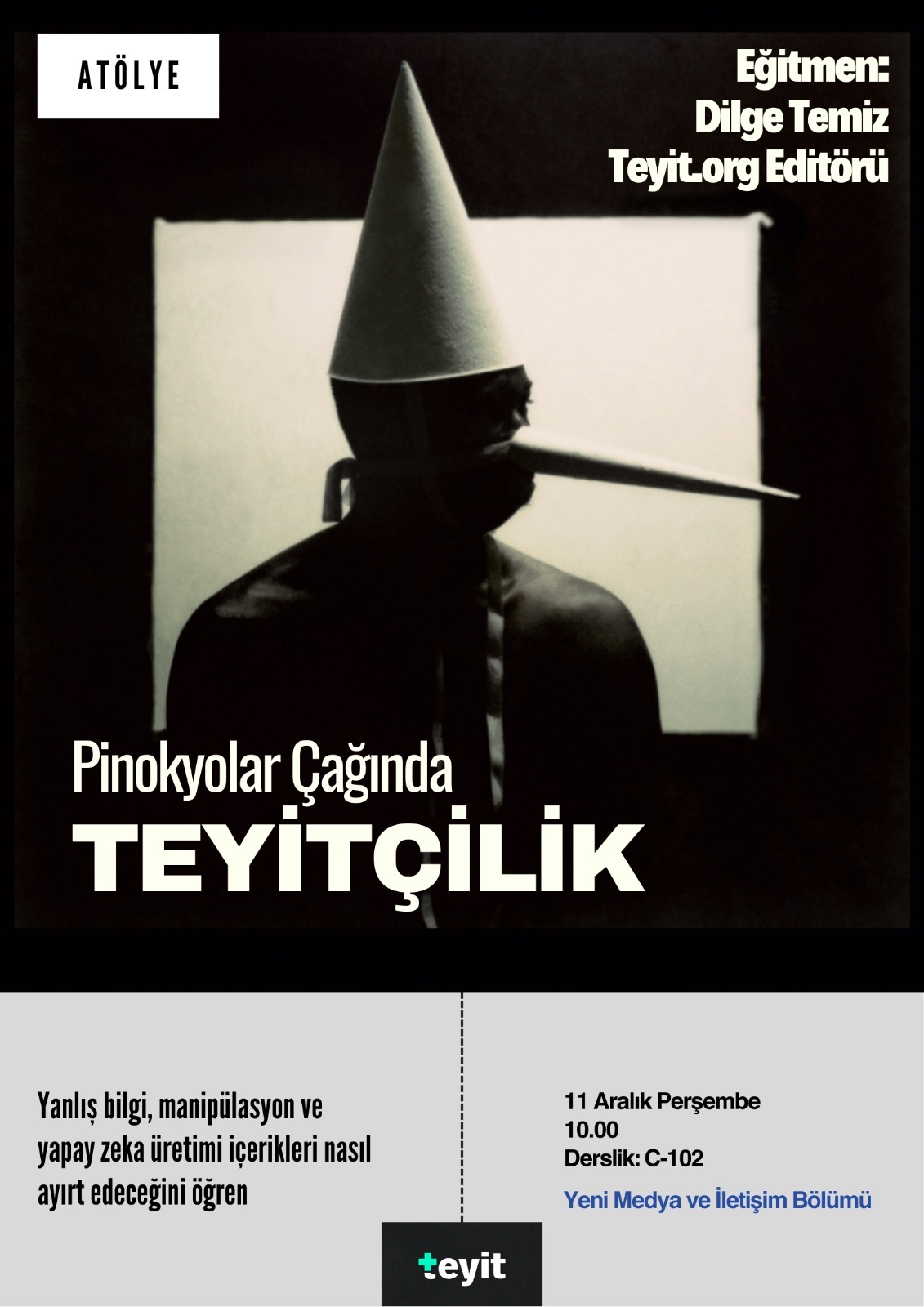 Yeni Medya ve İletişim Bölümü, dijital çağın en kritik sorunlarından biri olan yanlış bilgi yayılımına karşı öğrencilerin yetkinliklerini artırmak amacıyla "Pinokyolar Çağında Teyitçilik" başlıklı bir eğitim ve atölye çalışması düzenledi. Teyit ekibinden Editör Dilge Temiz’in eğitmenliğinde gerçekleşen etkinlikte, öğrencilerimiz dijital dedektiflik tekniklerini uygulamalı olarak deneyimleme fırsatı buldu.