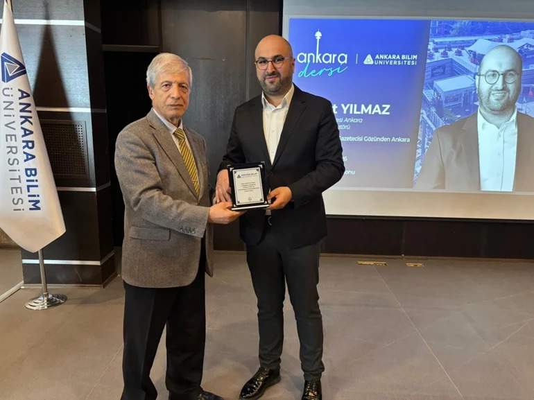 Yılmaz, özetle şunları söyledi: “Ankara, rahmetli İlber Ortaylı’nın da söylediği gibi sıradan bir şehir değil. Burası bir kere Cumhuriyet’i kuran bir şehir. Mustafa Kemal Atatürk’ün şehri. Bunun farkında olmamız gerekiyor. Geçmişe dönük medeniyetlerin izlerini taşıyan bir şehir. Bugün gezip dolaştığımız her yerde farklı farklı medeniyetlerin izleri var. Örneğin, Ankara Kalesi. Bize miras kalan, dünyada içerisinde halen yaşamın devam ettiği nadir kalelerden biri. Hepimiz kafelerde vakit geçiriyoruz ama size tavsiyem kafeye değil de Kale’ye gidin. Gerçekten de başkent Ankara başta Kale olmak üzere saklı kalan bir hazine ve öykü. Bu şehrin farkında olun” dedi. Kentin sorunlarına da değinen Yılmaz, “Özellikle deprem felaketinin ardından Ankara güvenli liman olarak adlandırıldığı ve deprem riski az olduğu için tercih edildi. Sanayi kuruluşları bile İstanbul’dan buraya taşınmaya başladı. Bu durum da beraberinde barınma sonucuyla beraber konut arz talep dengesini biraz sarstı. Öte yandan trafik ve ulaşım da dikkat çeken bir seviyeye ulaştı. Bugün Ankara kişi başına düşen araç sayısı bakımından lider konuma geldi, bunun da etkisini hissediyoruz. Maalesef raylı sistem ağında da yetersiziz, dünya başkentlerine baktığımızda geride olduğumuzu görebiliyoruz. Başkentte nüfusta raylı sisteme ulaşabilen kişi dağılımı yüzde 35. Ankara, yıllardır bekleyen problemleriyle baş başa kalmış bir kent. Bir fuar alanına ihtiyacımız var, temeli atıldı ama öylece kaldı. Stadımız yıllarca yapılmayı bekledi, en son 1992 yılında burada milli bir maç oynandı inşallah yapımı tamamlandıktan sonra yeni stadımıza kavuşacağız. Sağlık ve eğitimde başkentimizin iyi bir konumda olduğunu düşünüyorum. Potansiyellerimiz çok fazla bunu iyi değerlendirme noktasında mantıklı adımlar atmalıyız” ifadelerini kullandı. Yılmaz, gelen soruları da yanıtladı. Konuşmaların ardından Yılmaz’a Ankara Bilim Üniversitesi Hukuk Fakültesi Dekanı Prof. Dr. Kadir Arıcı, plaket ve sözcük bağışı belgesi takdiminde bulundu.