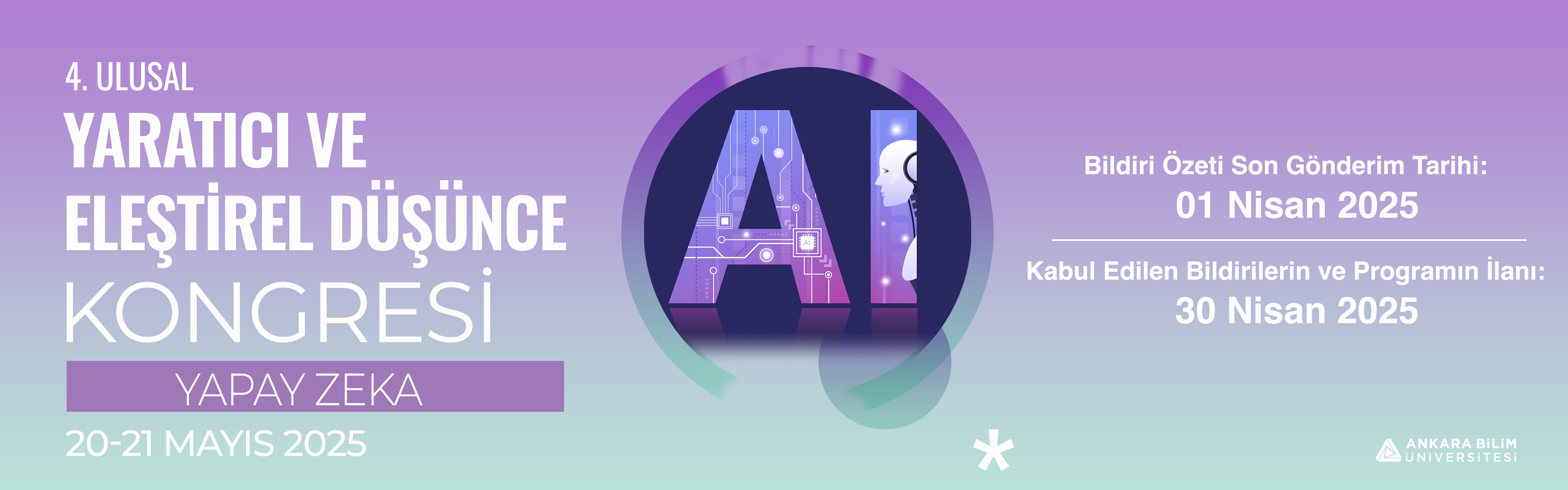 Ankara Bilim Üniversitesi Güzel Sanatlar ve Tasarım Fakültesi olarak, Yaratıcı ve Eleştirel Düşünce Kongresi’ni iki yıl ulusal, bir yıl uluslararası formatta düzenleyerek kazandığımız akademik birikim ve deneyimle bu yıl dördüncüsünü gerçekleştiriyoruz. Bu yıl, "Yapay Zekâ" ana teması etrafında eleştirel ve yaratıcı düşüncenin çok yönlü boyutlarını keşfetmek amacıyla disiplinler arası bir zeminde siz değerli katılımcılarımızı bir araya getirmeyi hedefliyoruz.